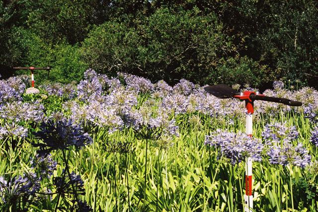 Tools of the Trade paid tribute to the farm labourers working in the wine industry. The wine producing valleys of Stellenbosch, Franschhoek, and Paarl appeal to and cater for a supposedly sophisticated, educated and exclusive market: in a sense an extension of the farming communities that were settled from the time the Europeans arrived in the Cape. However, at the time the industry largely rested on an unstable and troubled social structure fuelled by alcoholism, abuse (particularly of women and children), and a tradition of exploitation of the workforce. While some farmers and sectors of the industry were at pains to change this reality, this harsh juxtaposition was seen by many to be actively maintained and manipulated for the benefit of the industry as a whole. This sculpture, scattered amongst the flowerbed near the slave bell on the Spier estate, paid homage to the workers and the humble tools of their trade and speaks of how their economic disempowerment ties them to the land.